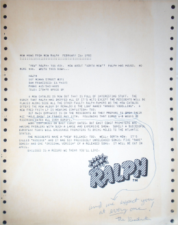"New News From New Ralph" was a press release issued by New Ralph on February 26th 1983, following The Cryptic Corporation's move from their headquarters at 444 Grove Street in San Francisco to a smaller space at 109 Minna Street following the resignation of John Kennedy.