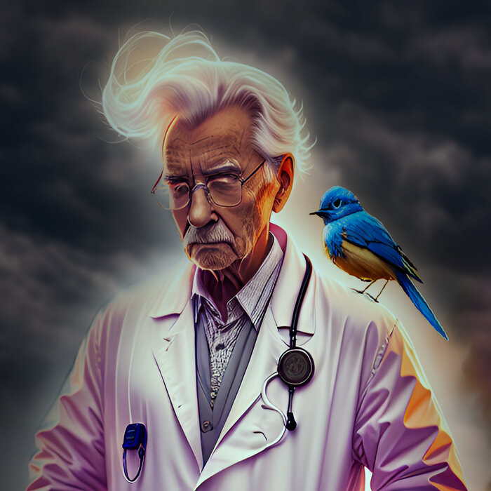 A lengthy interlude deadens the room, until the bluebird unexpectedly rises into the air, gracefully glides around it and lands on the teenager's shoulder. With little hesitation, the boy drops the gun, approaches the doctor, and nods yes. At this moment Doctor Dark begins his own shocking transition. No longer restrained by the illusions of life, the physician displays his true form: the Angel of Death. For a few moments, the sound of Dark's machine fills the room, before giving way to the bluebird grandly chirping "Ol' Man River" as the teenager stands transfixed by its curious and unexpected beauty.