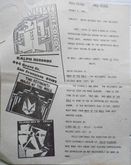 Ralph Records issued a press release on August 1st 1981 to promote the label's releases planned for the fall of that year; Mark of the Mole by The Residents and Claro Que Si by Yello.