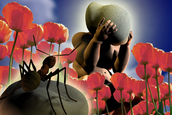 The ant liked the man. He was a hard worker and ants appreciate hard work. When the human first arrived, the anthill was at the edge of a small forest, but soon the trees were removed and shortly afterwards the man built and occupied a large and stately home, not far from his unknown neighbors, the ants. And, with the building of a stable, a guest house and servants' quarters, his industry continued. Occasionally the ant paused to watch as the man, arrogant and successful, entertained guests on the sunlit expanse of his grass covered lawn, proudly displaying his children and attractive young wife. But beyond the lawn and its surrounding flower beds, the ant knew nothing of the human's existence. The small creature had no idea what went on inside the big house, or how the man earned his income, or what he ate for dinner, but the tiny animal easily recognized the acrid odor of change, and the odor was in the air. The man's children, who often spent entire days running and playing on the lush and exquisite lawn, had disappeared. His wife, who quietly stood at the side of her rich and successful husband, entertaining his prosperous friends, had also vanished. As had the servants, the horses, the dogs, cats and everyone who had occupied the small estate - except the man. And lately he always seemed to be outside, staring at his flowers. His tulips. The pride of his life and the envy of his peers. But lately there weren't any parties. And no friends. Just tulips. The ant didn't understand flowers. They were all right to look at, but were obviously worthless in terms of food or shelter. And the man no longer seemed to care about anything else. "Oh well, it's time to go back to work," thought the ant.
