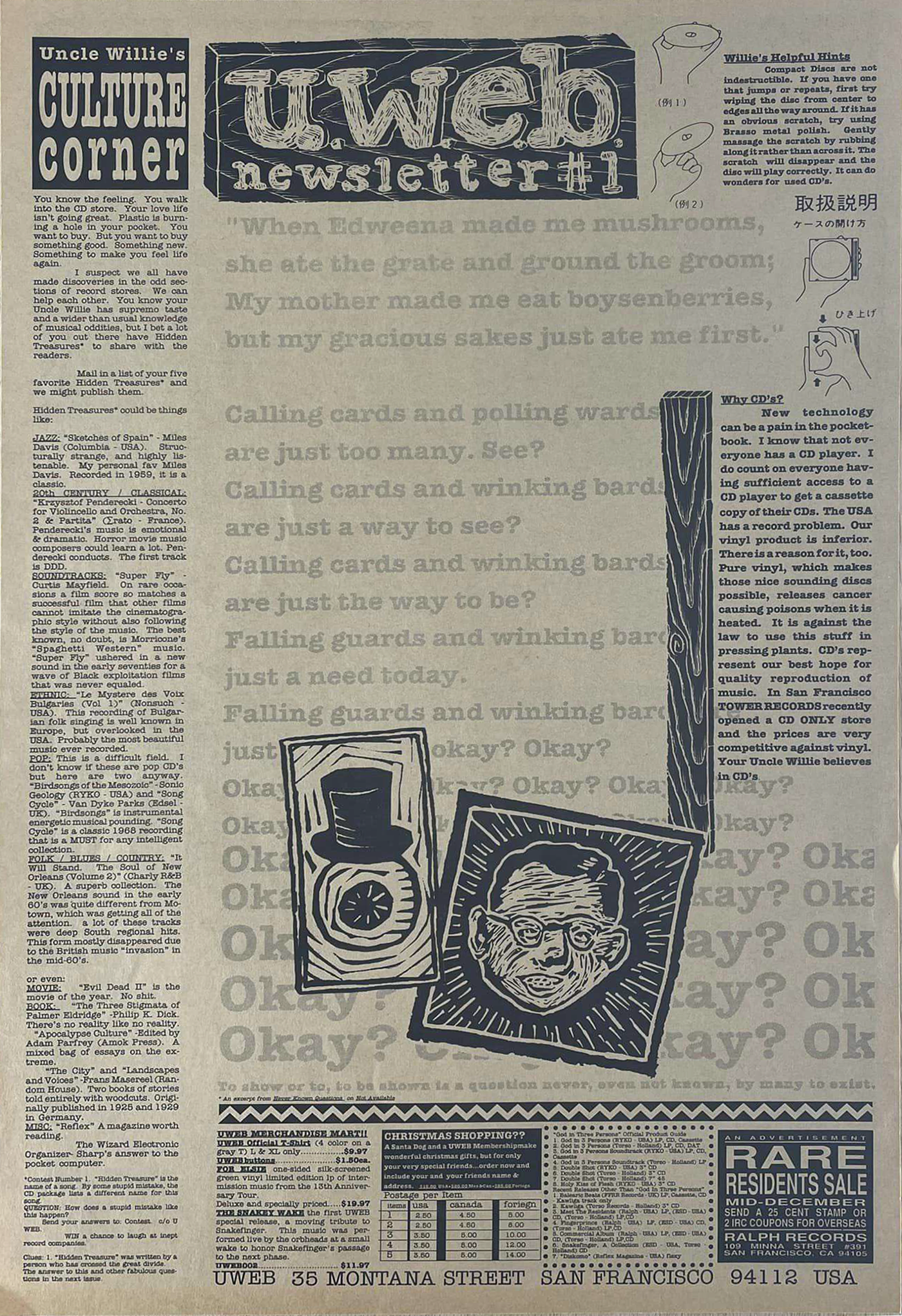 UWEB Newsletter Vol. 1, No. 1 is the first issue of the newsletter published by the official Residents fan club UWEB. The newsletter was published in December 1988.